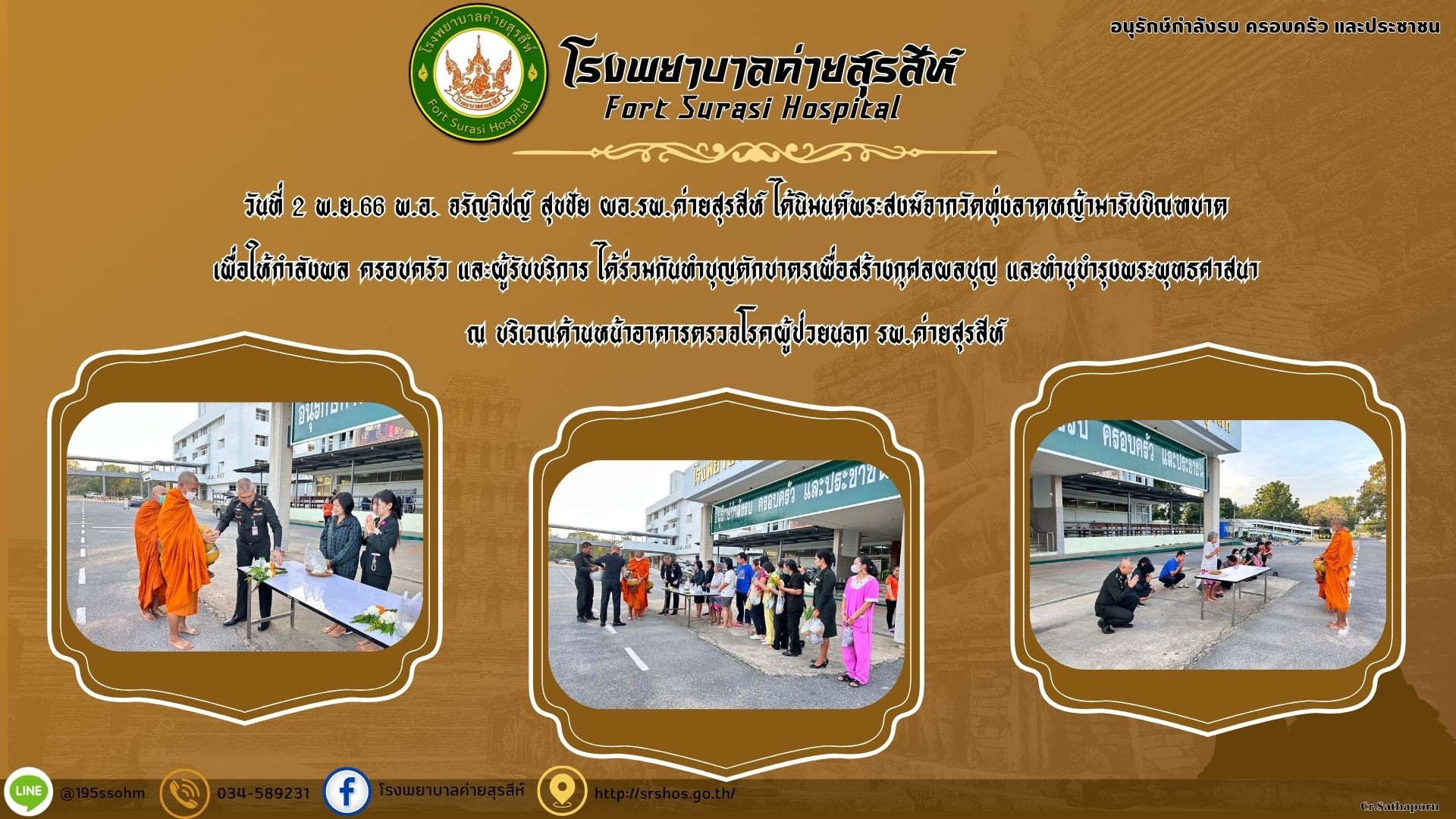 วันที่ 2 พ.ย.66 พ.อ. จรัญวิชญ์ สุขชัย ผอ.รพ.ค่ายสุรสีห์ ได้นิมนต์พระสงฆ์จากวัดทุ่งลาดหญ้ามารับบิณฑบาต
